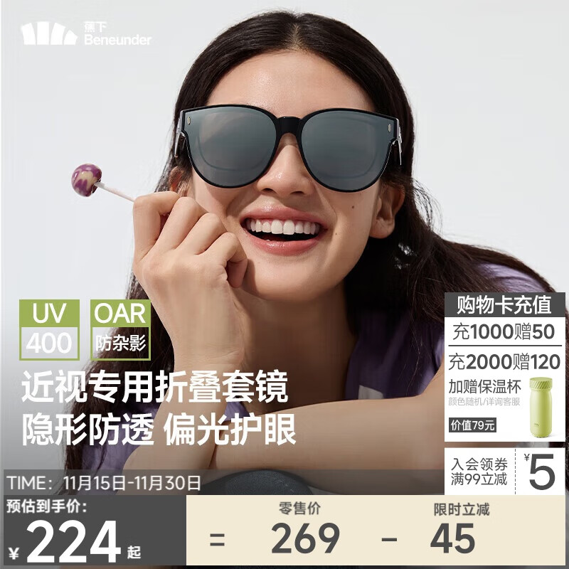 蕉下(beneunder)近视可戴太阳镜套镜折叠近视墨镜开车防强光大方圆框户外出游