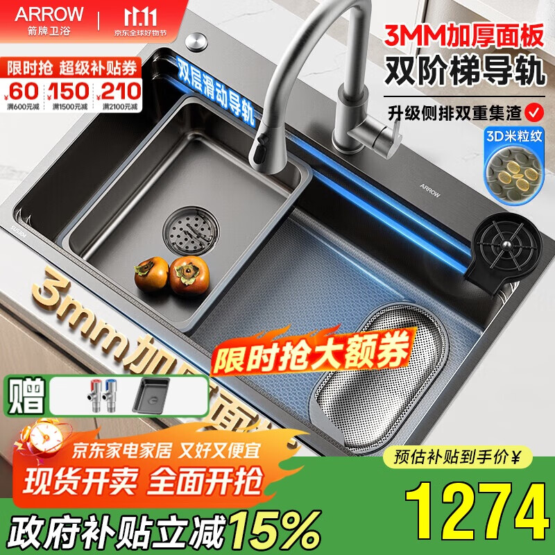 箭牌3mm加厚水槽大单槽304不锈钢洗菜盆手工纳米集渣【政府补贴15%】