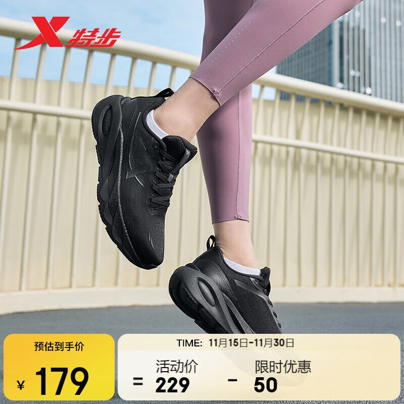 特步凌步2女跑步鞋运动鞋春季新品轻便缓震厚底增高女跑鞋休闲鞋黑