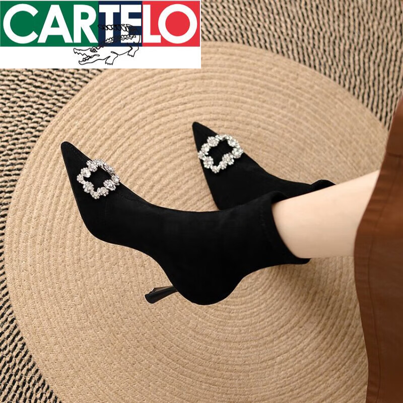 卡帝乐鳄鱼(CARTELO)水钻方扣短靴女细跟瘦瘦靴弹力靴2025秋冬韩版尖头磨砂气质高跟鞋 黑色 34