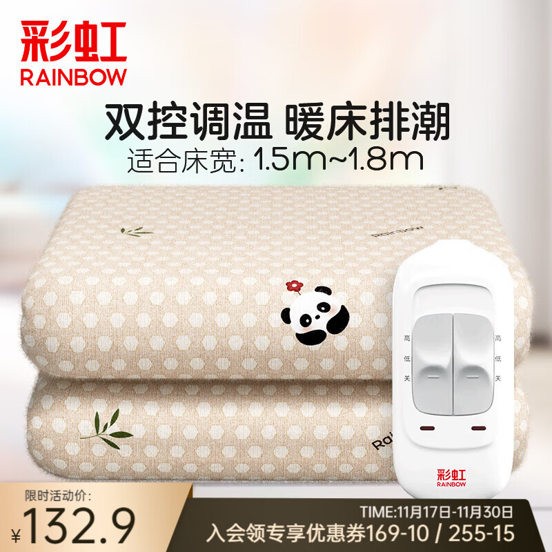 彩虹(RAINBOW)电热毯双人双控(2.0/1.8/1.5米)三档调温电褥子花色控制器随机 三档调温 长1.8米宽1.5米无纺布