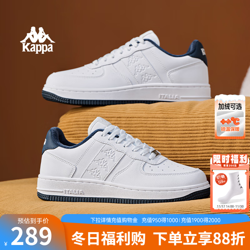 KAPPA卡帕背靠背女鞋加绒板鞋女2025冬季新款保暖棉鞋女休闲运动鞋子女 经典白/海昌蓝【加绒款】 38