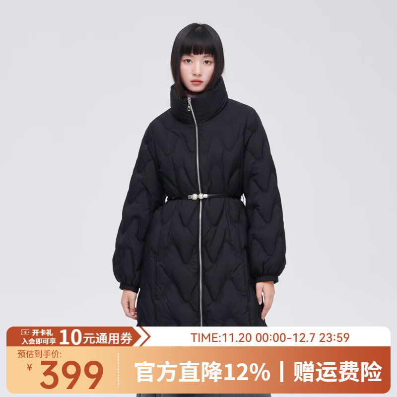 艾莱依(ERAL)商场同款女士中长款羽绒服珍珠皮腰带收腰甜美风设计感潮流 炭黑 M 160【建议110-130斤】