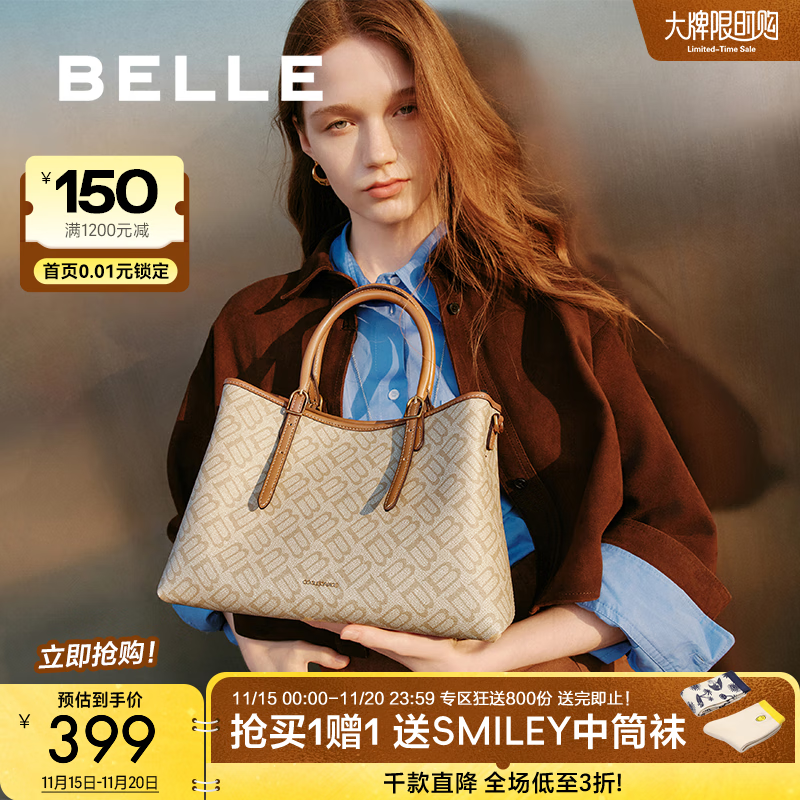 百丽(Belle)女包包25海鸥老花复古通勤2025大容量托特包X7238AX5 杏色 F