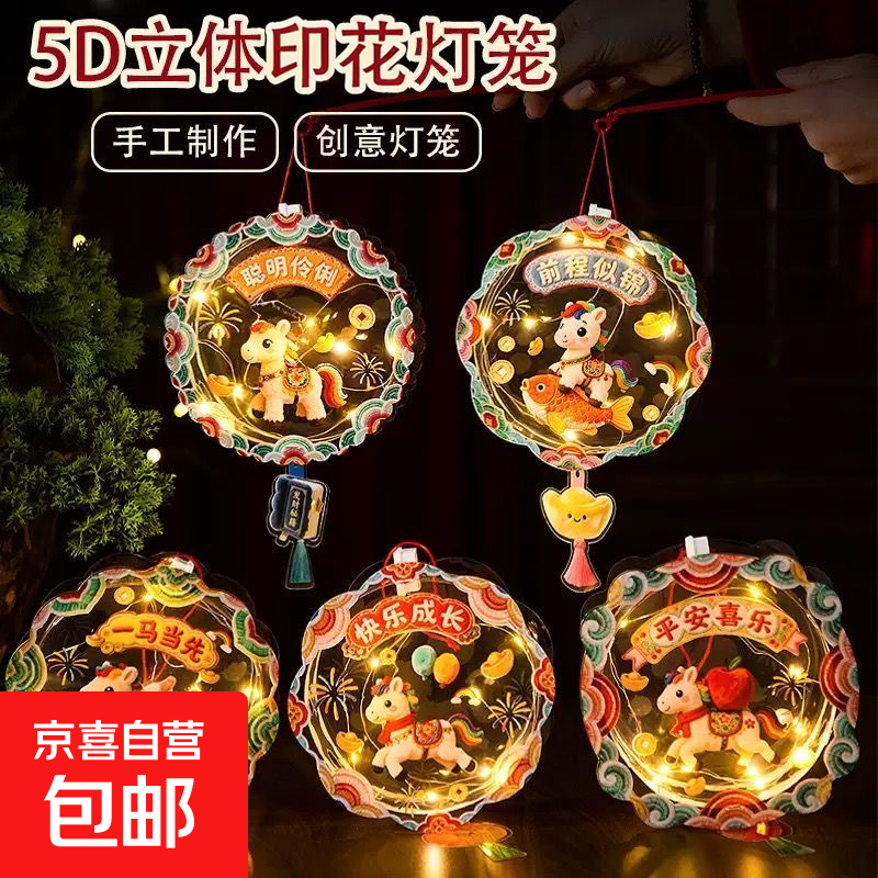 马年5D立体印花灯笼手提发光花灯手工diy塑料材料包过年儿童卡通 【限时特价】5D立体印花灯笼【1个|款式随机】
