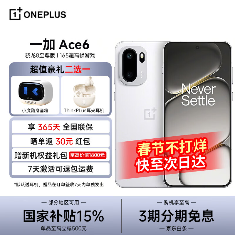 一加 Ace 6 【国家补贴】超满配 超预期 骁龙 8 至尊版 新品5G游戏手机 闪白 12GB+256GB 官方标配