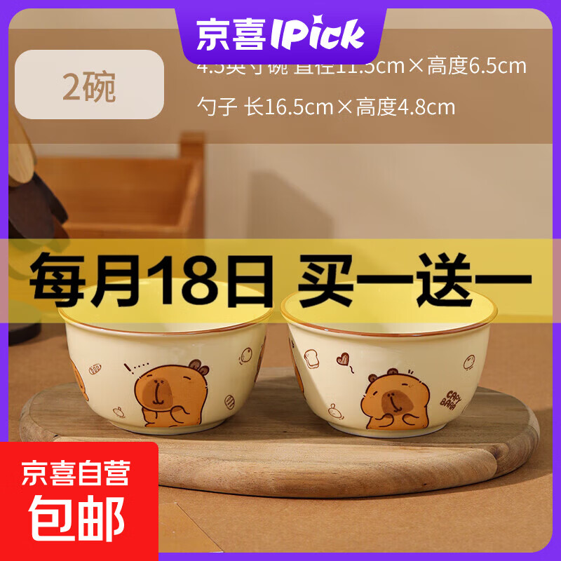可爱卡皮巴拉斗笠碗4.5英寸饭碗家庭装釉下彩米饭碗精致儿童饭碗 4.5英寸碗【2个装】
