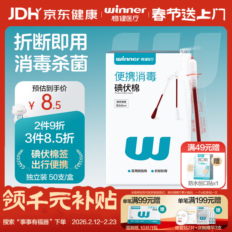 稳健医用碘伏消毒液棉签50支 独立装双头折断式伤口清洁棉棒成人婴儿