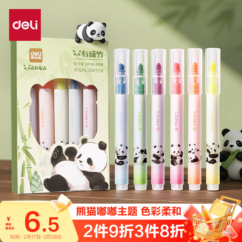 得力可爱熊猫6色荧光笔 考试复习划重点彩色醒目标记笔手帐笔 学生文具 6支/盒 SK181