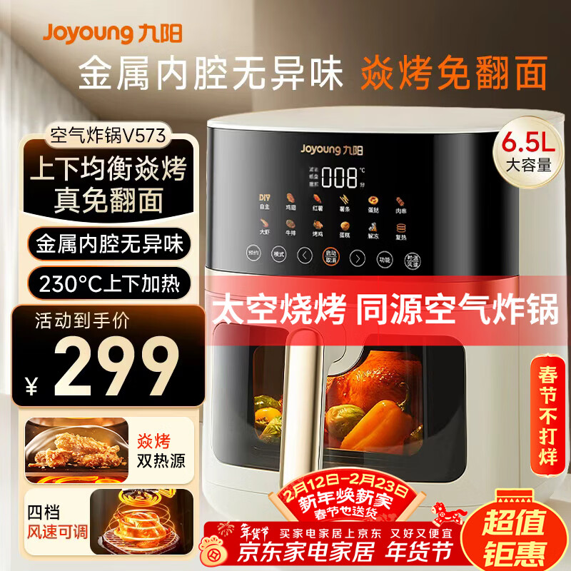 九阳(Joyoung)空气炸锅家用炎烤免翻面上下双热源6.5L大容量焱烤可视大视窗多功能金属内腔 KL65-V573