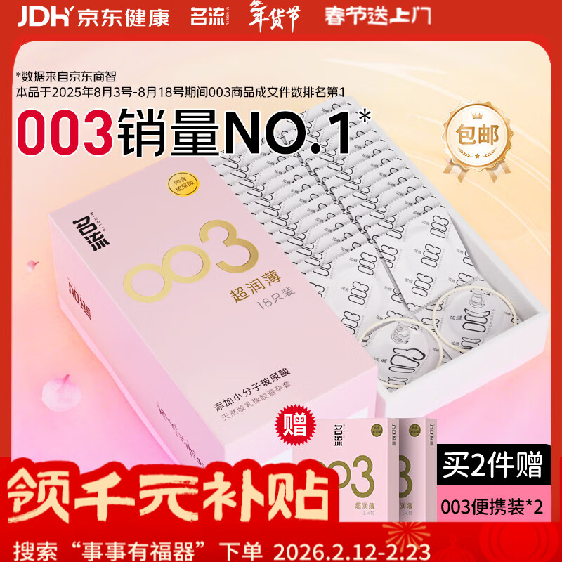 名流避孕套安全套套003玻尿酸润滑超薄隐形18只byt成人计生男女用年货