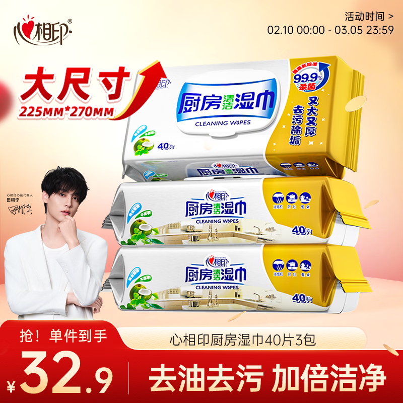 心相印厨房湿巾 40抽*3包 金装 强效去油污厨房专用湿纸巾 新旧随机发
