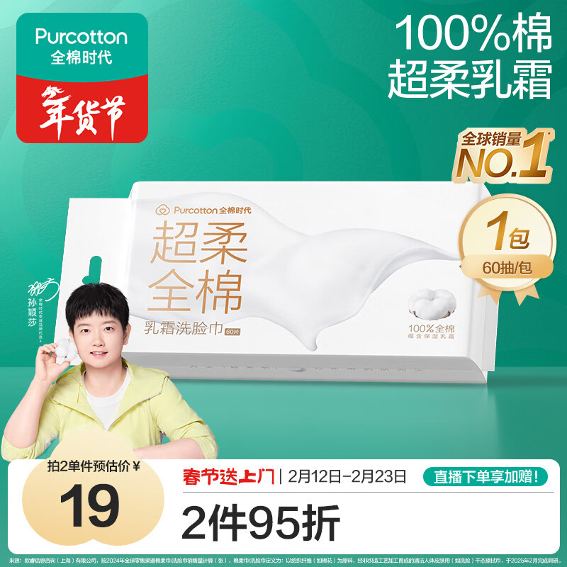 全棉时代【孙颖莎同款】乳霜洗脸巾 60抽/包*1加厚悬壁挂式100%棉柔巾毛巾
