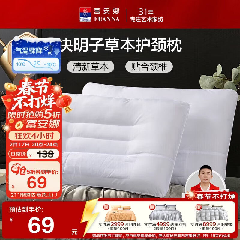 富安娜京爆 枕头芯颈椎枕芯决明子成人枕头两只深度睡眠枕一对装74*48cm