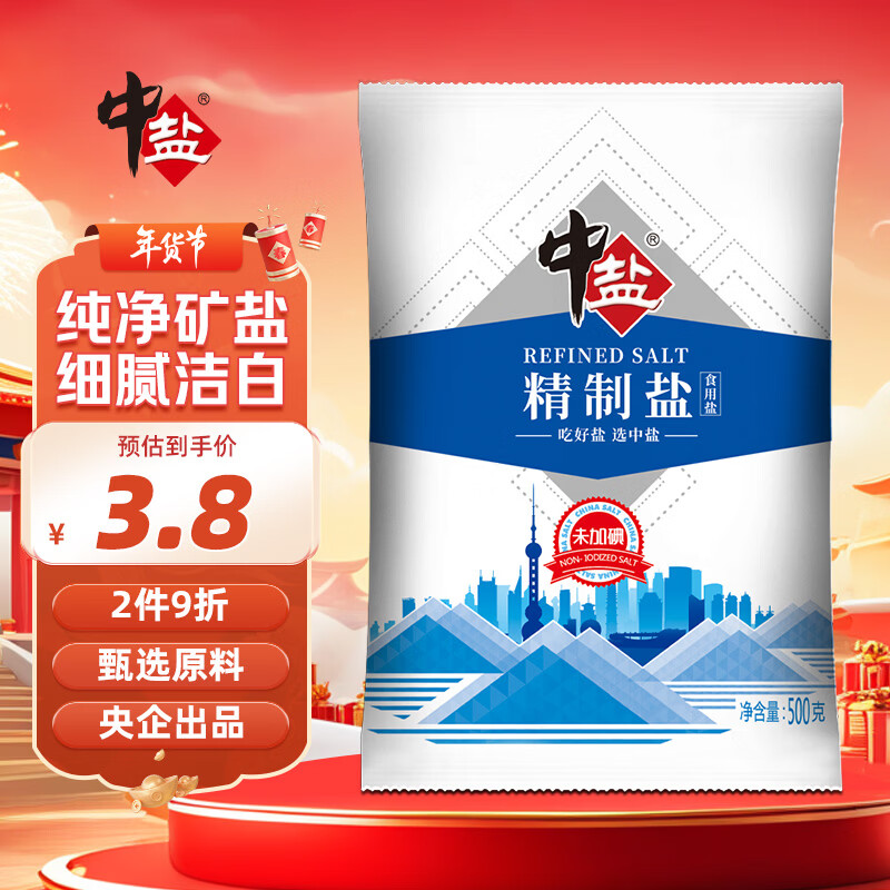 中盐 精制盐500g 【未加碘 井矿盐】食用细盐 无碘食用盐 中盐出品