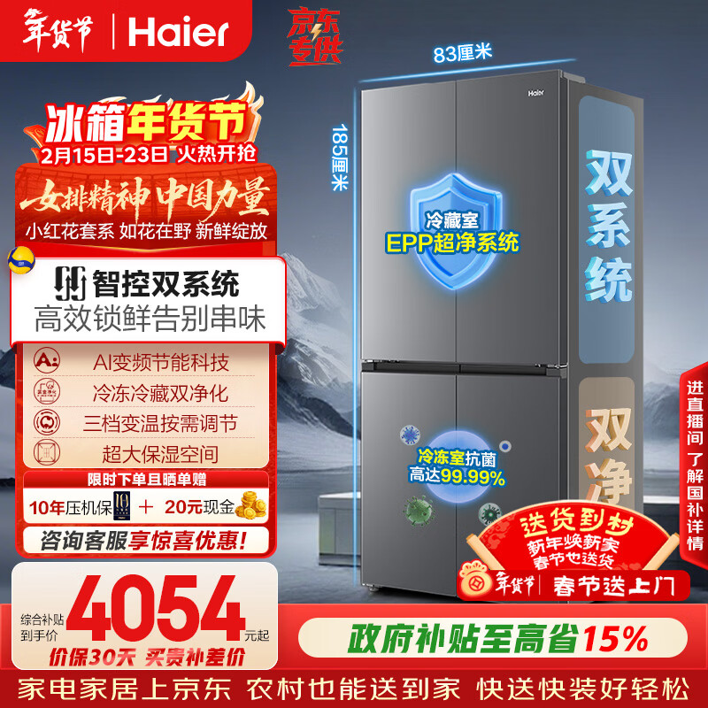 海尔(Haier)「小红花系列」548L十字门冰箱双系统双净化0串味99.99%除菌变温空间BCD-548WGHTDC9FSU1国家补贴