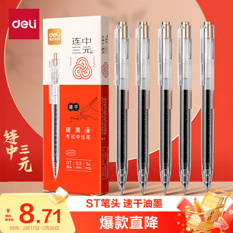 得力(deli)速干按动考试中性笔 0.5mmST笔头学生刷题笔考试笔 备考考试专用 黑色5支/盒SA510