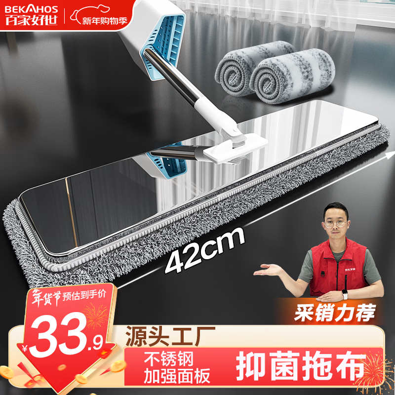 百家好世平板拖把42cm2布抑菌家用一拖净免手洗2025不锈钢懒人拖地神器