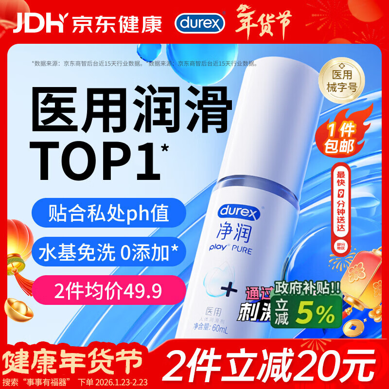 杜蕾斯(durex)净润人体医用润滑液60ml 情趣用品润滑剂润滑油成人房事免洗可舔