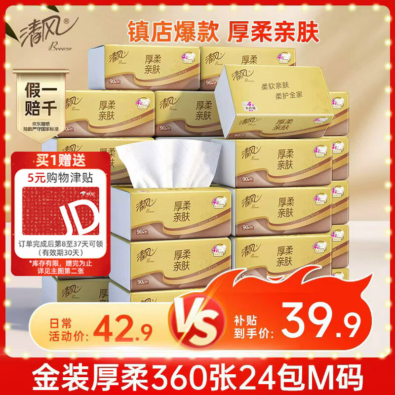 清风抽纸金装厚柔 360张*24包M码 4层纸巾抽 面巾纸餐巾纸 整箱装