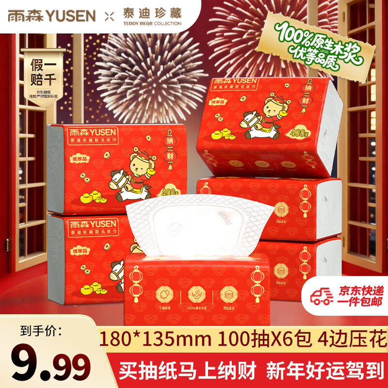 雨森(YUSEN)泰迪珍藏马上有钱新年抽纸4层100抽6包面巾纸餐巾纸源头直发包邮