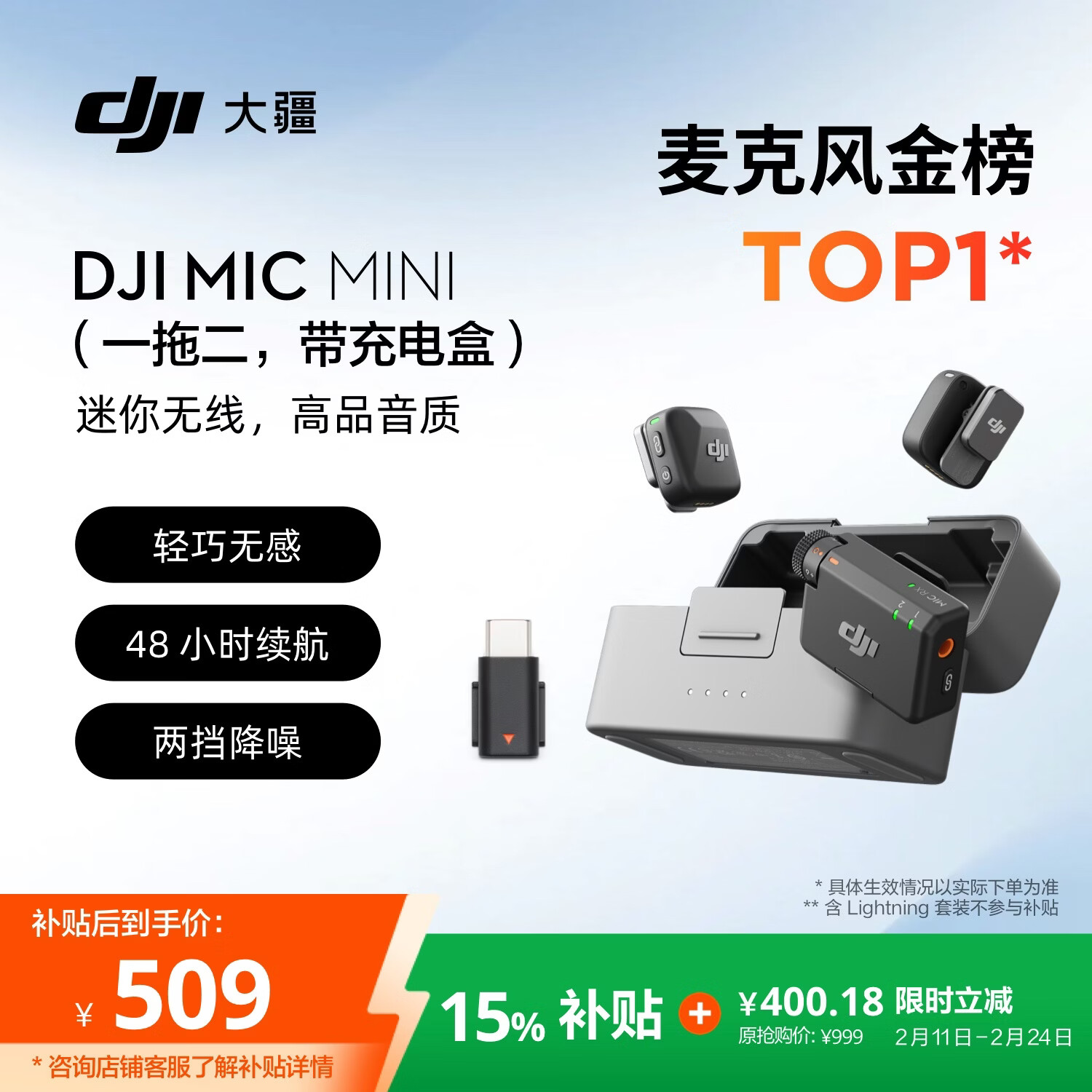 大疆 DJI Mic Mini 迷你无线高品音质降噪领夹麦克风【安卓+苹果15/16/17系列+相机】一拖二(含充电盒)