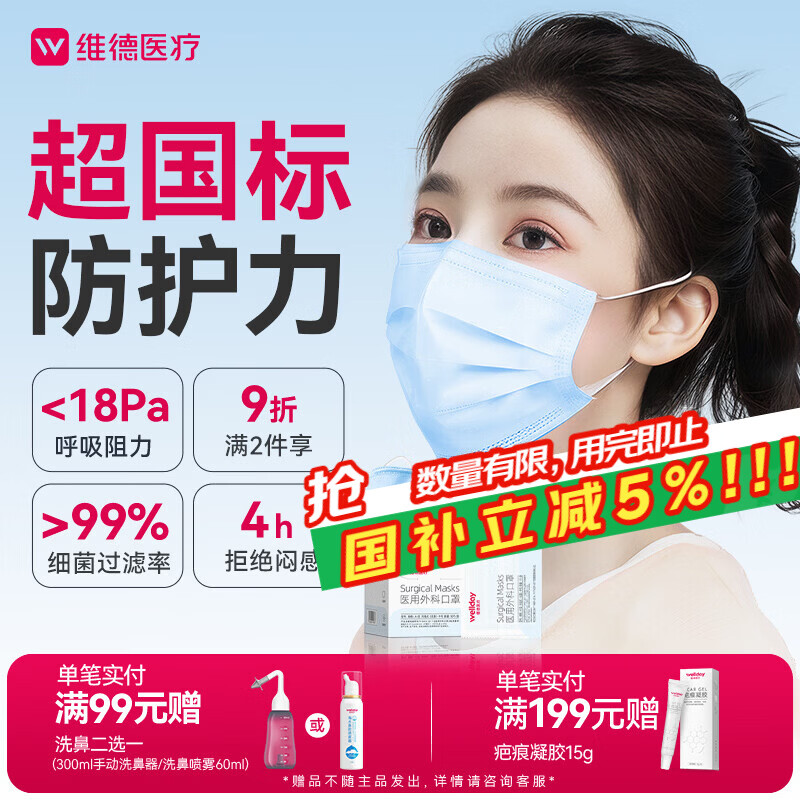 维德(WELLDAY)一次性医用外科口罩成人50只/盒独立包装三层透气防尘防飞沫灭菌