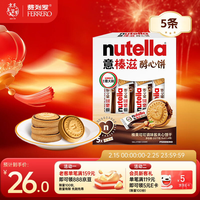 意榛滋 费列罗 nutella醇心饼可可酱夹心饼干5条207g 年货礼盒