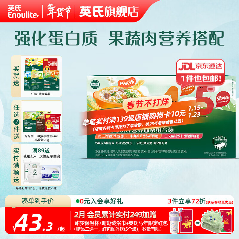 英氏宝宝面条 6个月婴儿面条婴幼儿童钙铁锌营养面条搭配食品宝宝辅食 【12-18月】4-5阶面条组合装450g