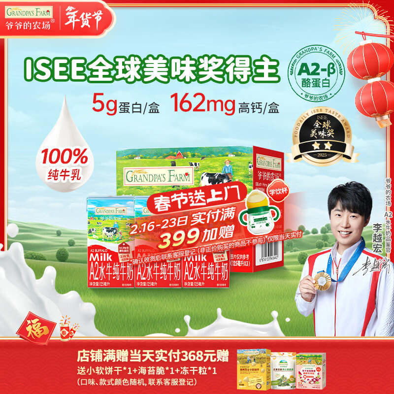 爷爷的农场A2水牛奶125ml*3盒 高钙 5g/盒优质蛋白纯牛奶儿童早餐生牛乳