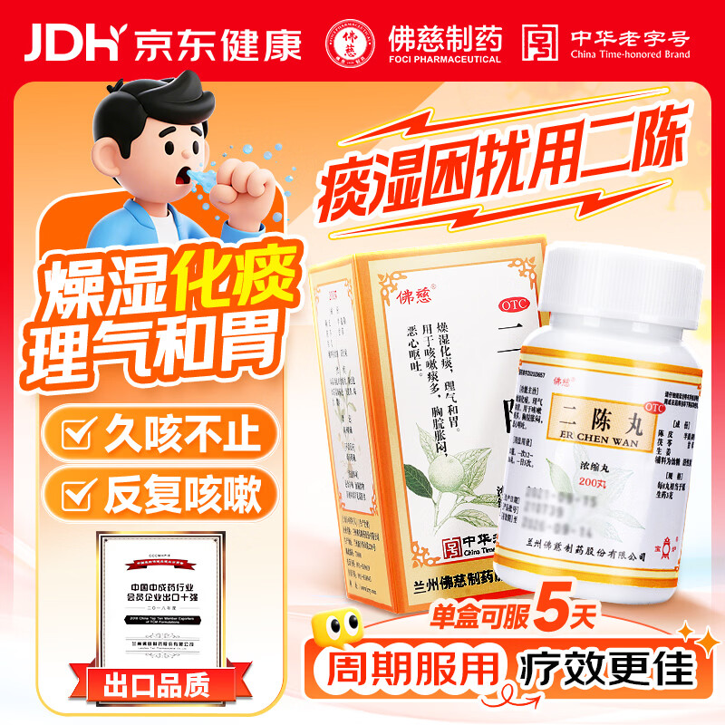 【常备安心】佛慈 二陈丸(浓缩丸)200丸 止咳祛痰燥湿化痰理气和胃恶心呕吐咳嗽痰多胸脘胀闷止咳药