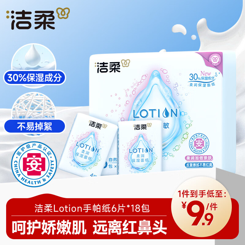 洁柔手帕纸 Lotion保湿因子加厚4层6片*18包纸巾小包 母婴可用超mini