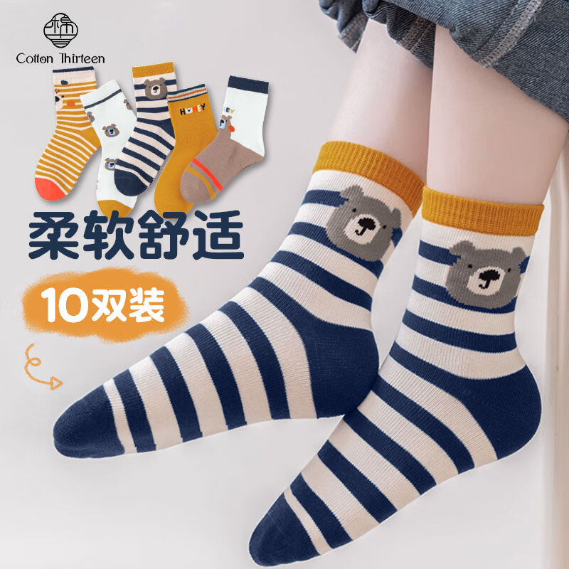 棉十三儿童袜子春秋季男童中筒袜男孩宝宝袜中大童学生可爱卡通熊10双tt