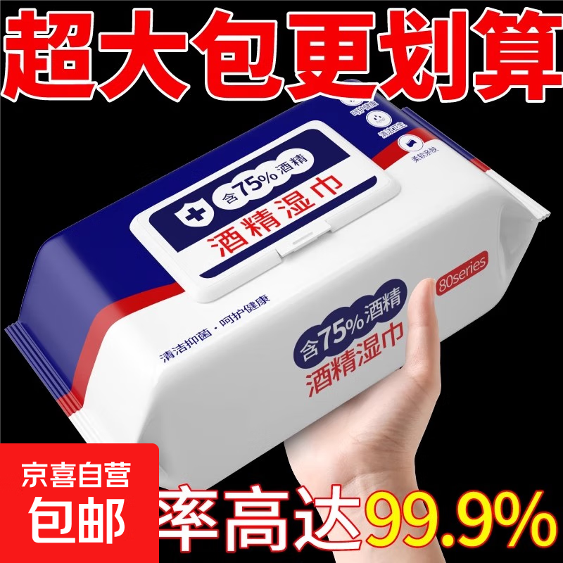 京东物流 75度酒精消毒湿巾家用卫生杀菌专用湿纸巾大包抑菌便携 小蓝酒精湿巾(80抽)