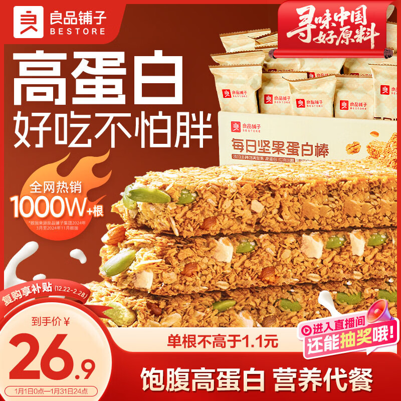 良品铺子坚果蛋白棒500g燕麦谷物棒威化压缩饼干能量棒代餐饱腹健身零食