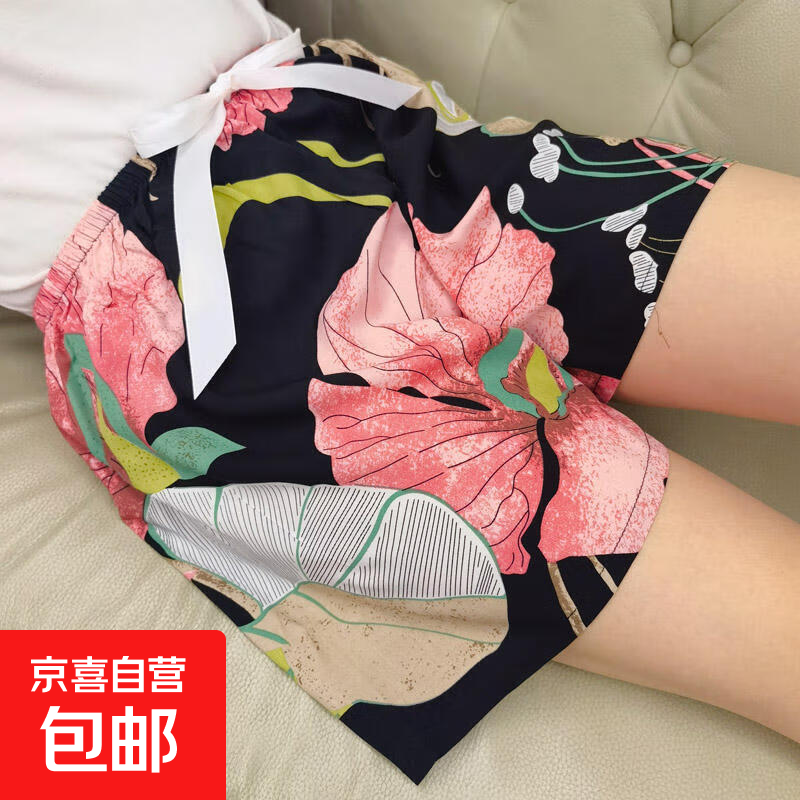 夏季绵绸睡裤女短裤宽松薄款居家裤睡衣大码胖棉绸家居裤子 黑底海棠 L 110-129斤