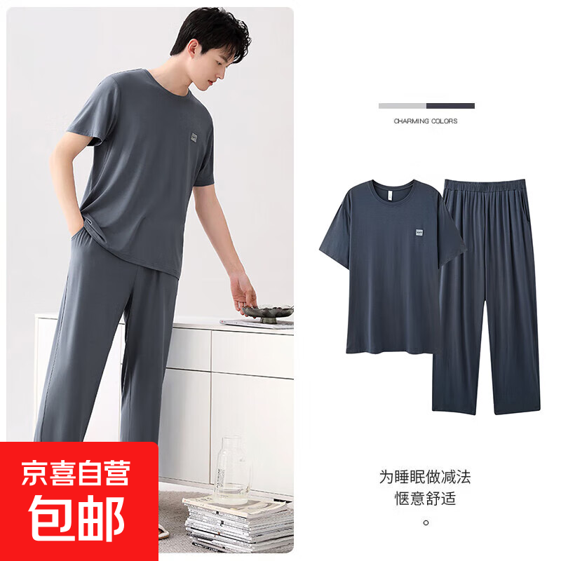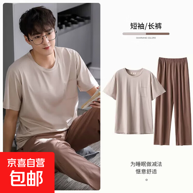 莫代尔睡衣男士夏季纯色短袖长裤家居服夏天薄款套头休闲套装短裤 2685 短袖长裤 L (建议100-120斤)