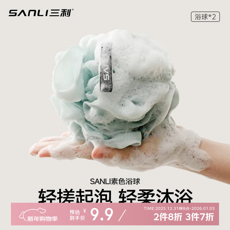 三利沐浴球浴花球加大2只装搓澡巾男女洗澡神器洗浴搓澡球澡花