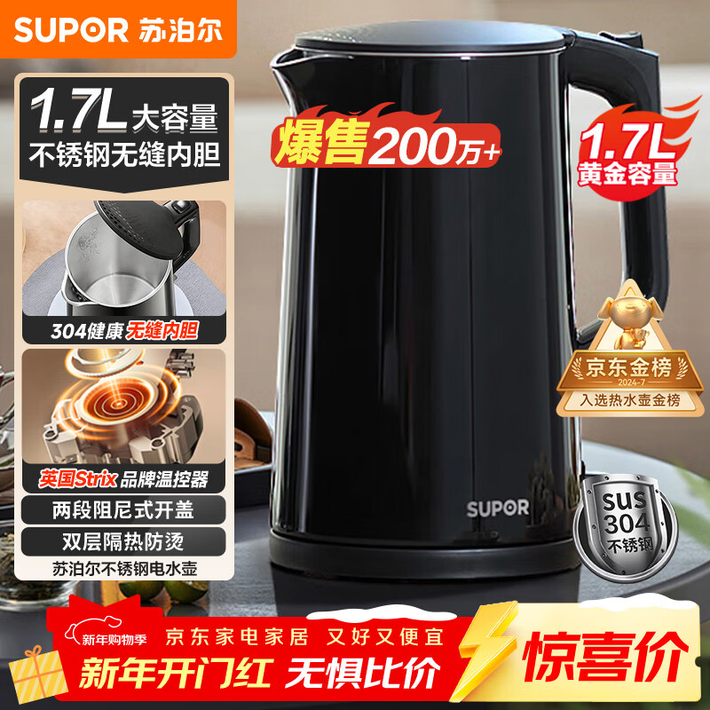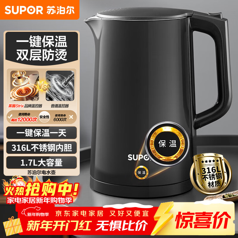 苏泊尔(SUPOR)电水壶热水壶 1.7L大容量全钢无缝电热水壶 316L不锈钢烧水壶 一键保温恒温 SW-17J12P