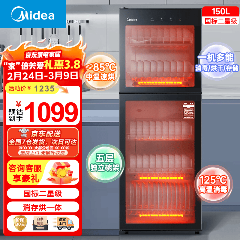 美的(Midea)消毒柜家用小型消毒碗柜大升数高温二星级立式厨房碗筷餐具茶杯母婴奶瓶消毒机150R02