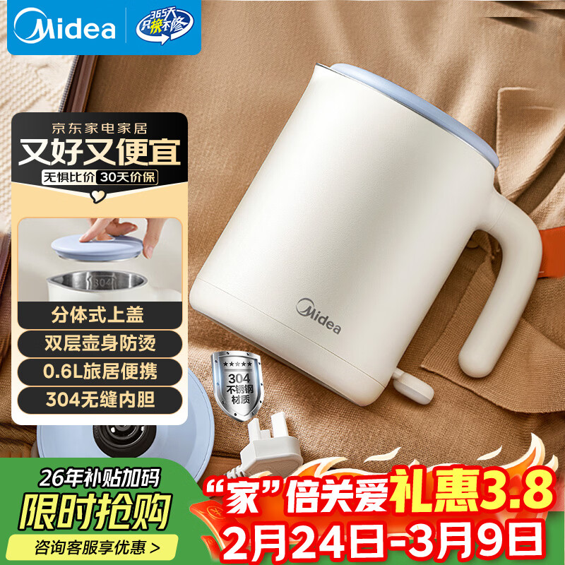 美的(Midea)电热水壶米色烧水壶便携式烧水杯差旅 0.6L智能断电304食品级不锈钢迷你便携小容量SH06X6-103