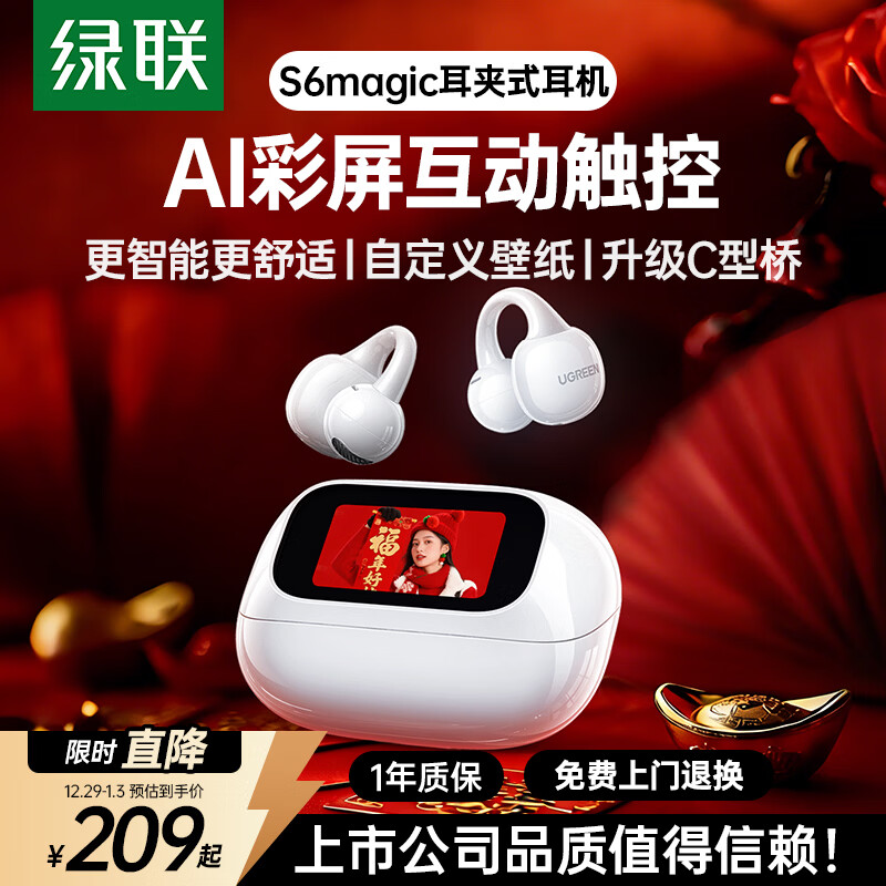 绿联 蓝牙耳机S6 Magic耳夹式智能触控屏气骨传导概念运动跑步游戏无线适用于苹果华为小米新年礼物