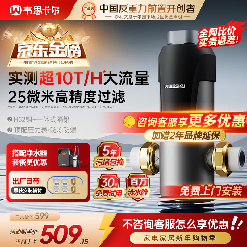 WISESKY韦思卡尔反重力前置过滤器10T/H大通量全屋家用前十名25微米反冲洗防爆防冻净水器 WSP-85-80T
