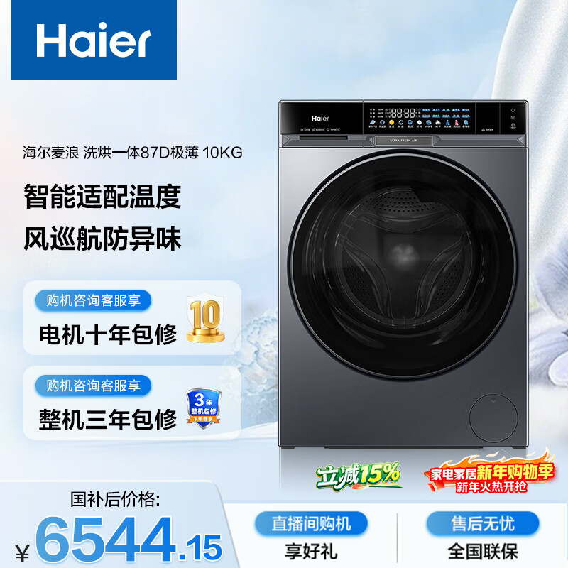 海尔(Haier)麦浪X11全自动滚筒洗烘一体 洗衣机带烘干一体10KG 超薄大筒径 自营 XQG100-PBSNE87DHU1