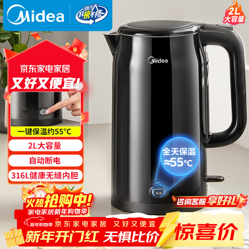 美的(Midea)电水壶电热水壶烧水壶自动断电一键保温一体 316L不锈钢2L大容量开水壶恒温壶MK-SHE2002-PRO