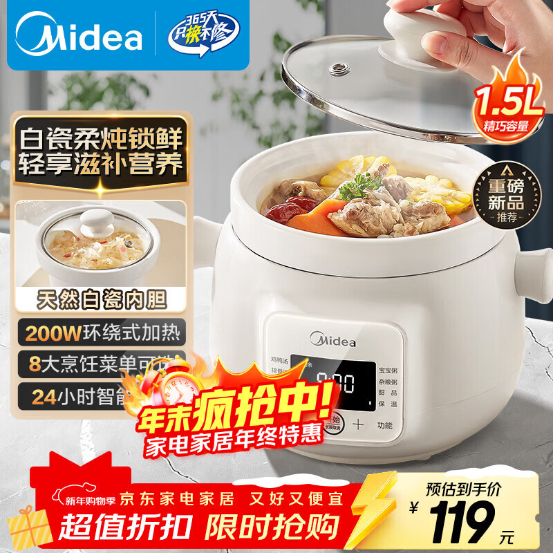 美的(Midea)电炖锅煲汤炖汤砂锅热水快炖 陶瓷炖汤盅母婴辅食锅燕窝熬粥 1.5L电炖盅白瓷柔炖大功率MD-DGE1556