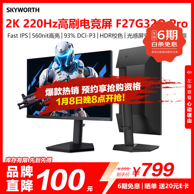 创维27英寸电竞显示器2K 220Hz 560nit高亮FastIPS光感屏变HDR400 10bit原生200Hz旋转升降F27G32Q Pro