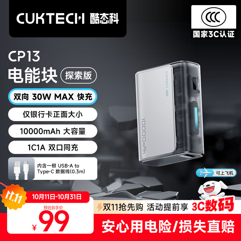 CUKTECH酷态科【3C认证可上飞机】10000毫安时电能块充电宝30W小巧便携快充移动电源支持苹果17/16/小米
