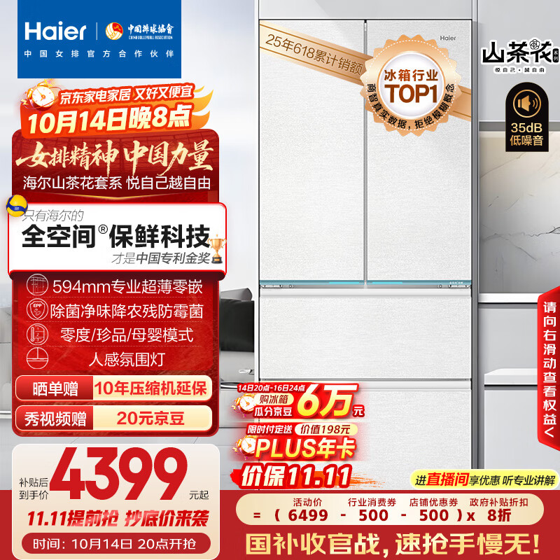 海尔(Haier)山茶花485升全空间保鲜594mm专业超薄零嵌法式多门电冰箱一级能效BCD-485WGHFD1BWLU1国家补贴20%