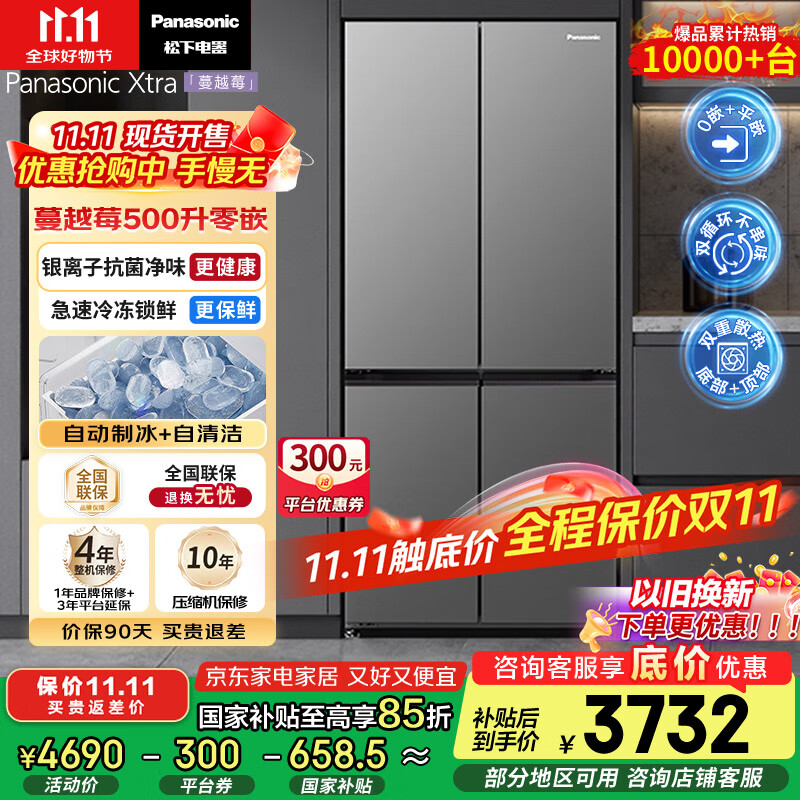 松下(Panasonic)【国家补贴】Xtra蔓越莓家用双开门冰箱十字门500升超薄零嵌入式四门电冰箱风冷无霜NR-XD50C5A-S